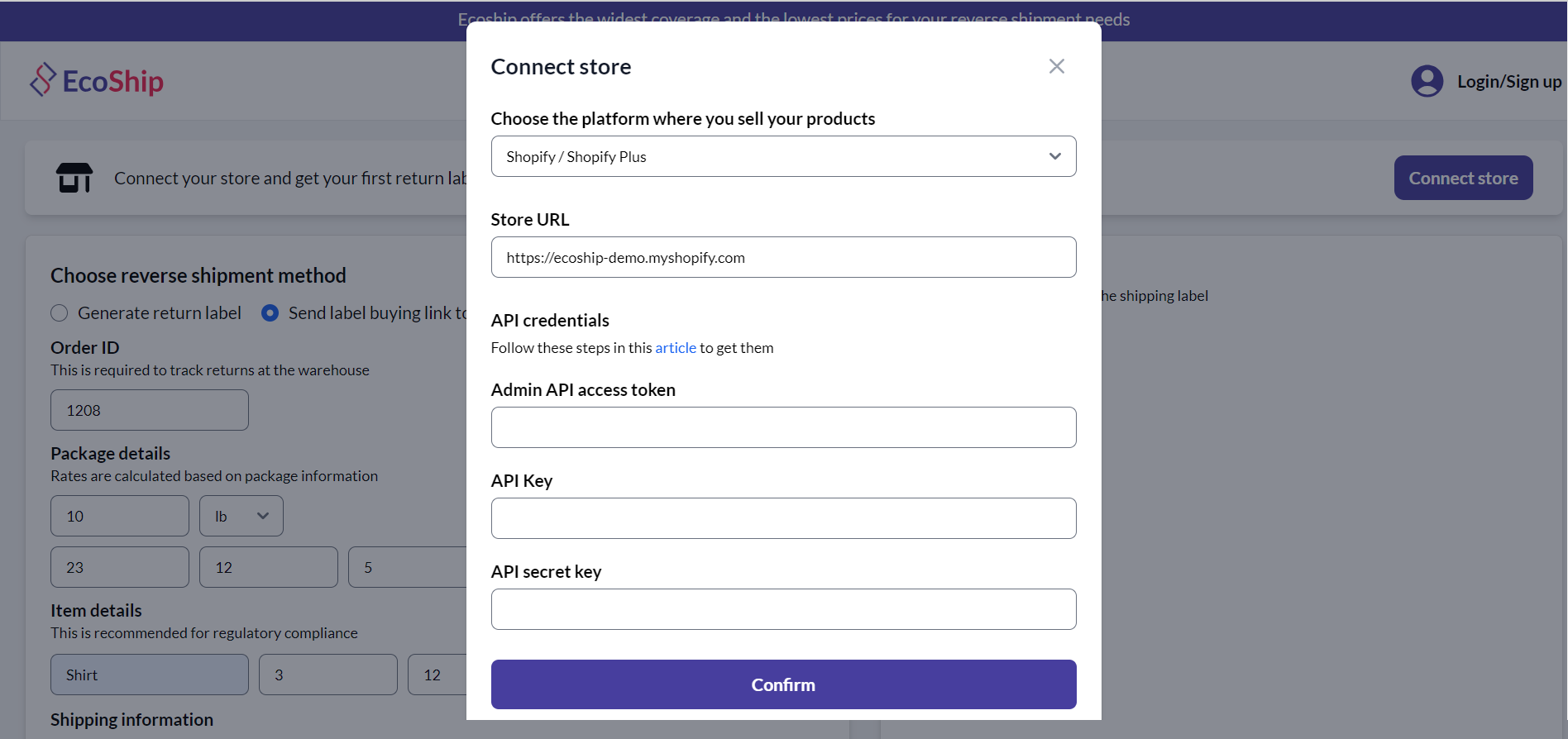 - You can add the API credentials in respective fields of your EcoShip dashboard, along with Store URL to connect your store.
