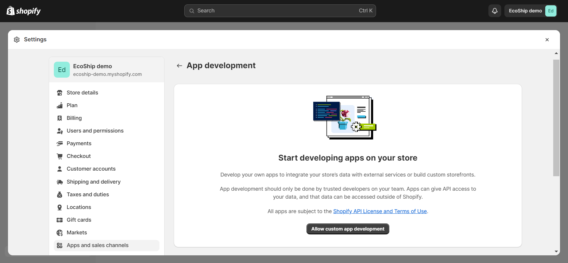 - If you've not created a custom app before you'll see this screen. Click on "Allow custom app development".