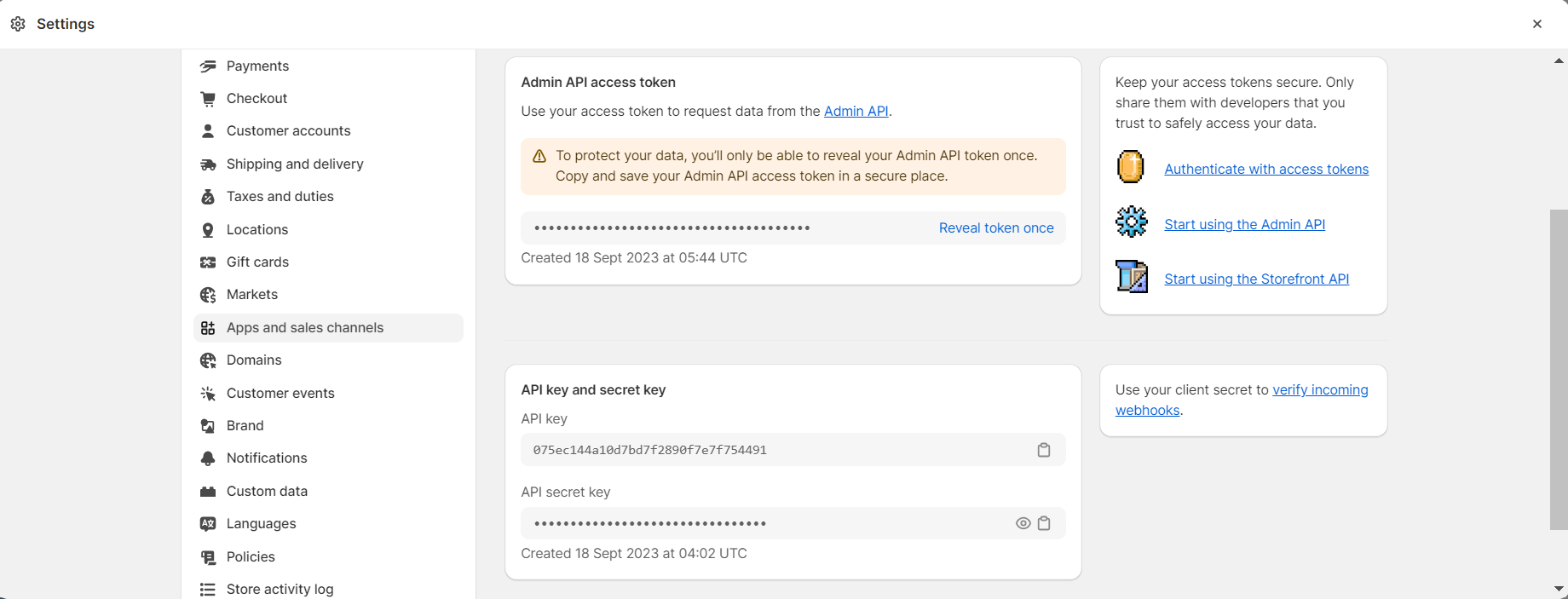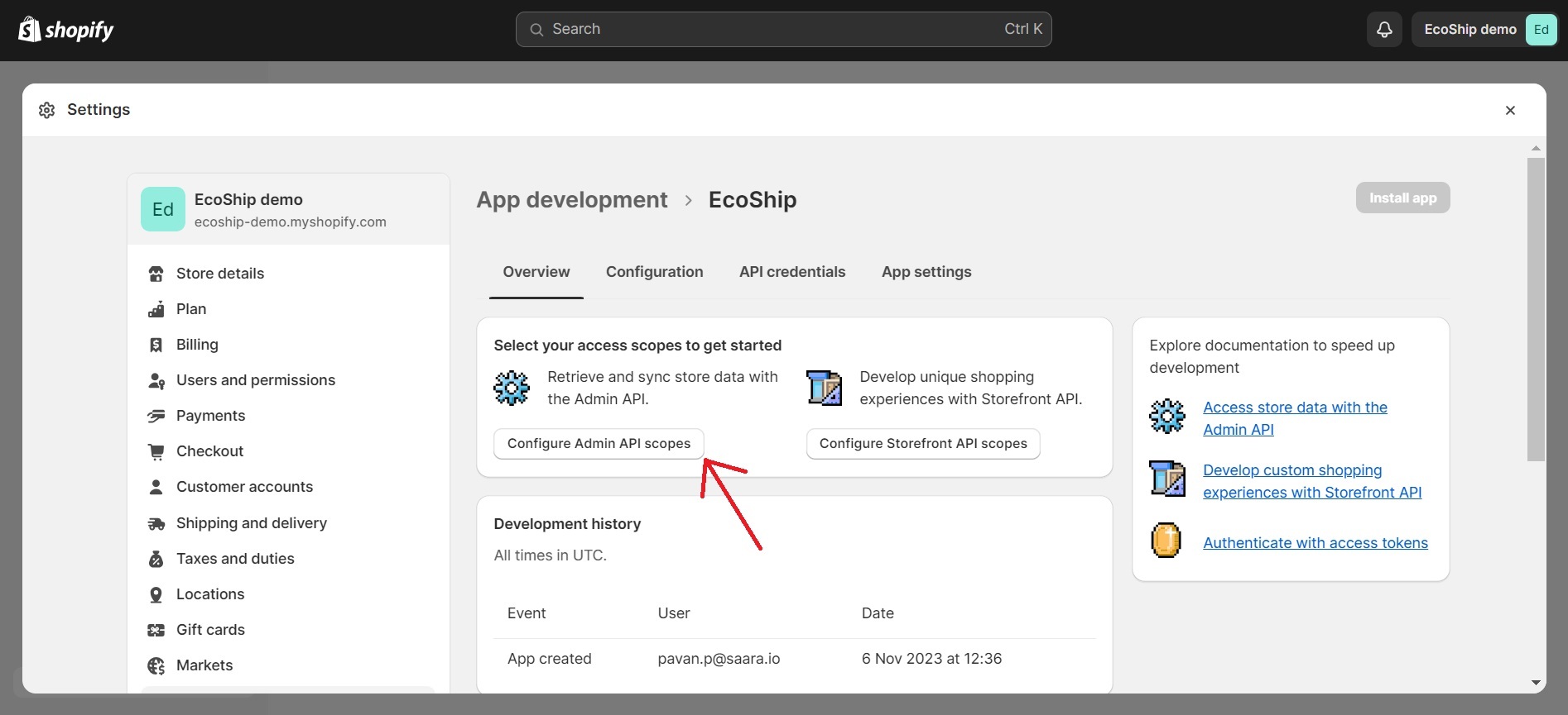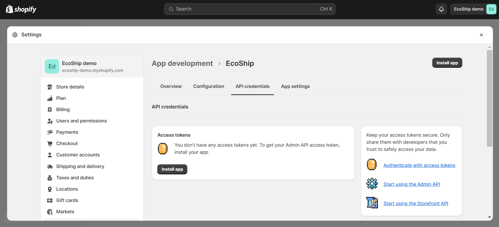- After you install, you'll be able to copy your Admin API access token, API key and secret key. These credentials are unique to each app you create and will be required for smooth functioning of EcoShip.