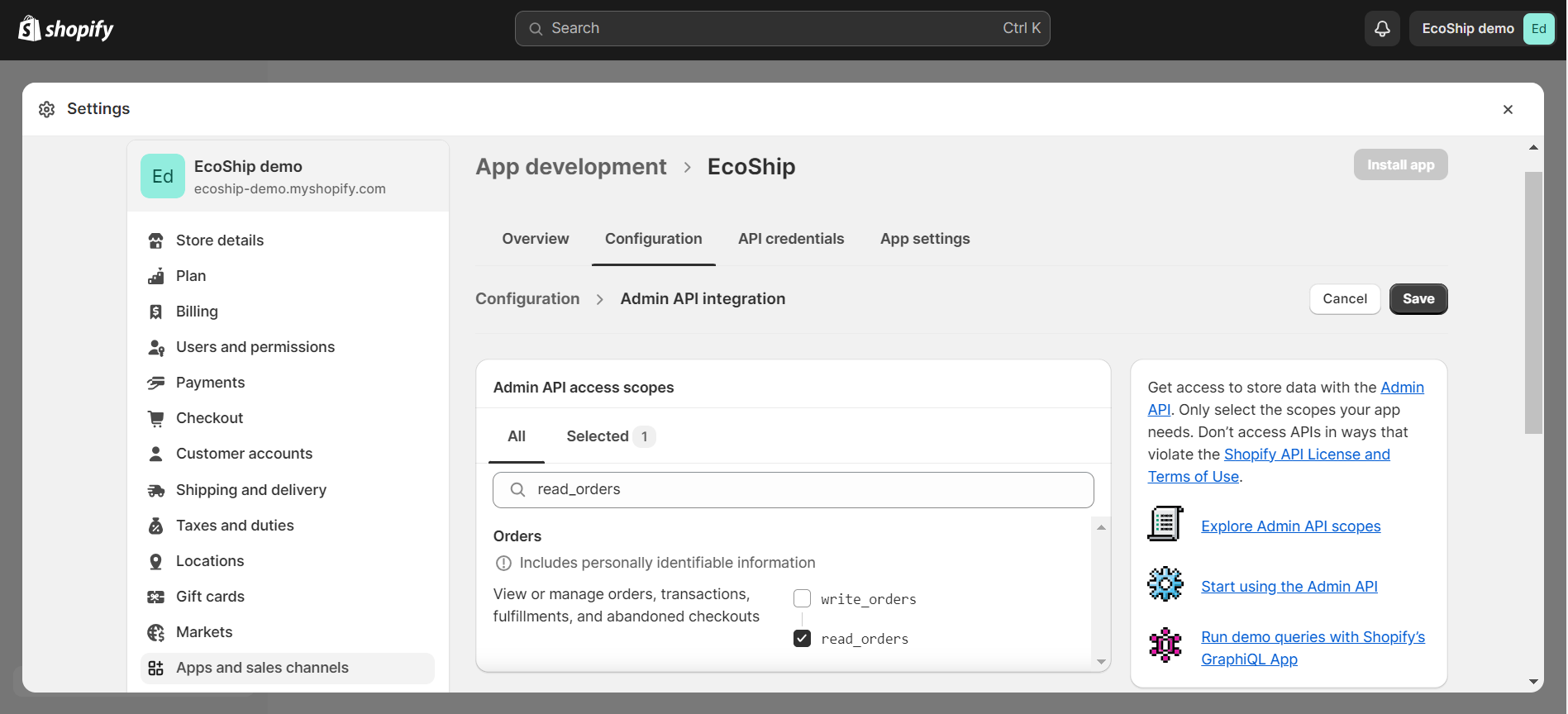 - Search for "read_orders" and select the permission. This will only be used to fetch the items in the order and their weights along with shipping address details.