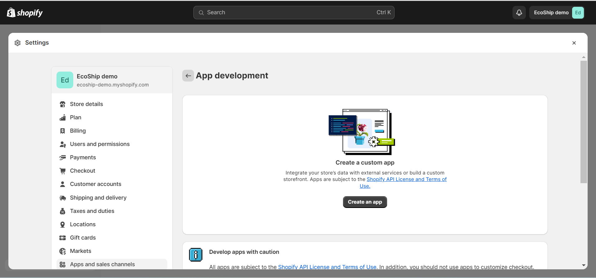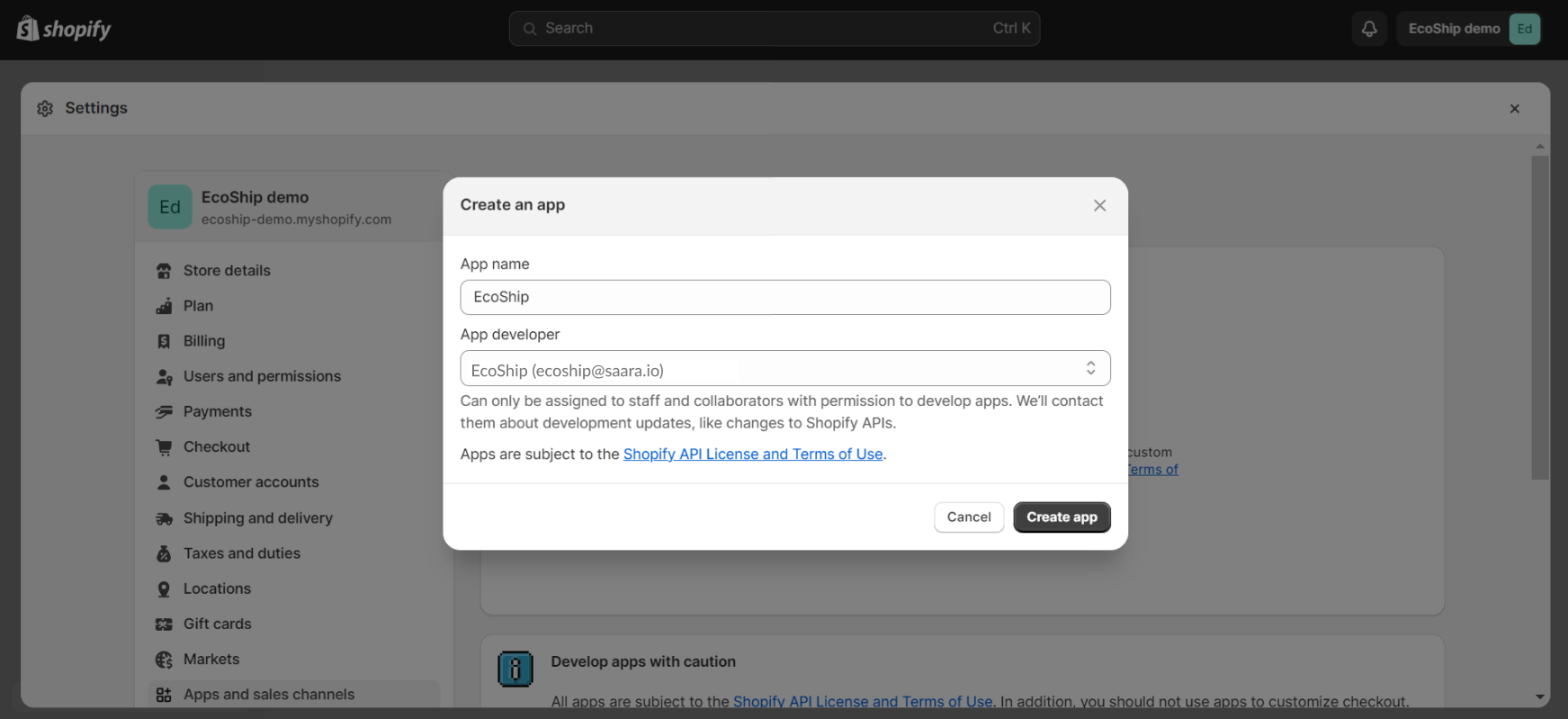 - You can enter the app name as EcoShip and select any app developer. Click on "Create app" after entering details.