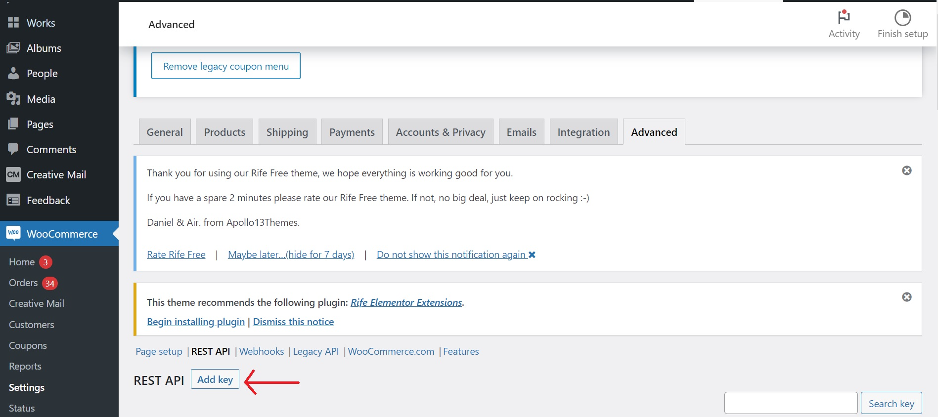 - After selecting the tab "Rest API", click on "Add key"