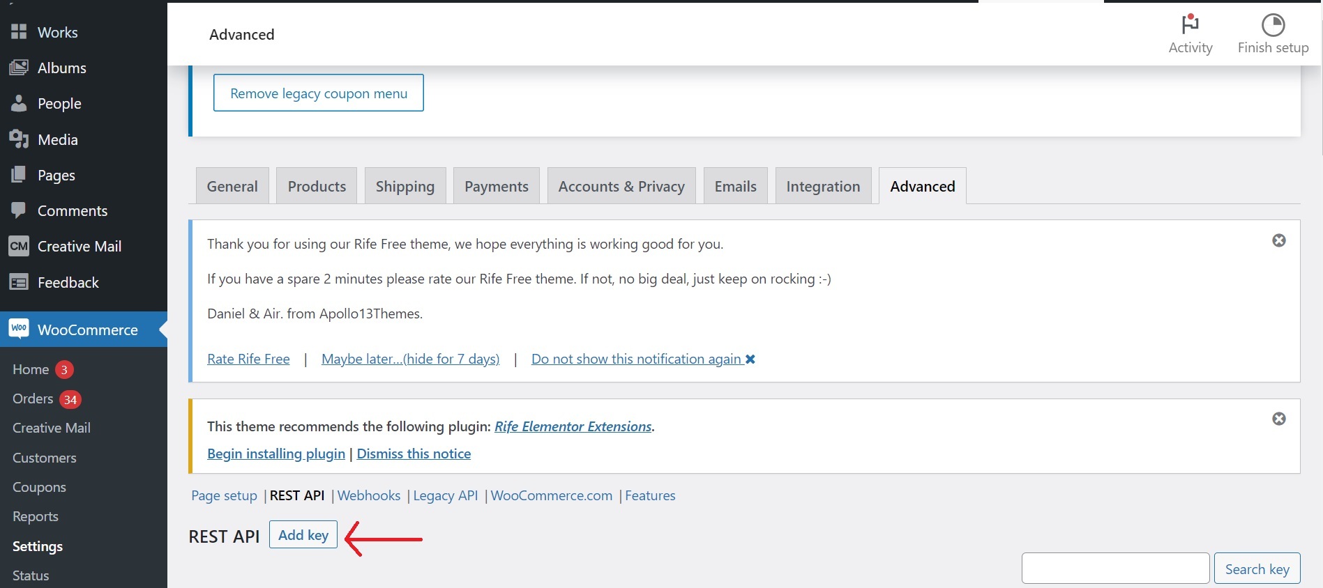- After selecting the tab "Rest API", click on "Add key"