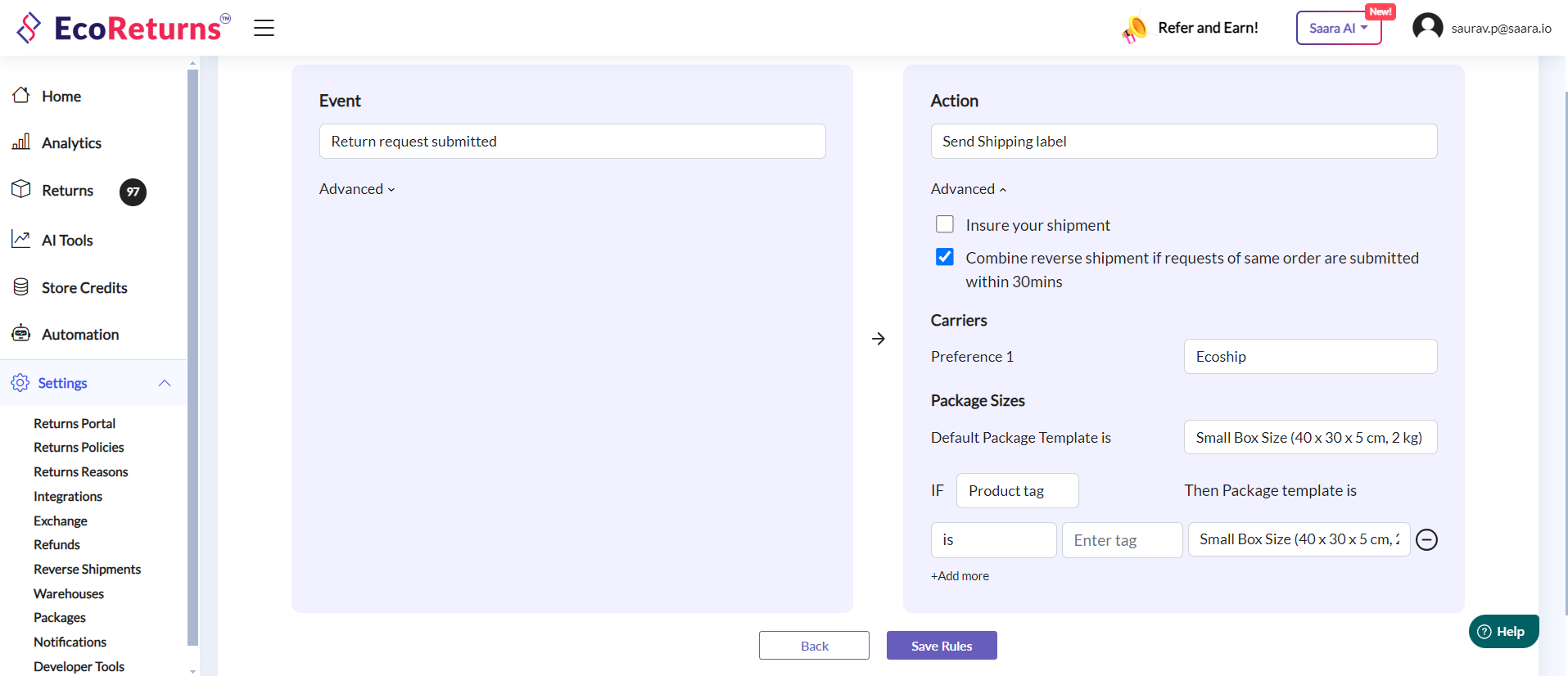 9. Package templates can even be used in automations. You can setup rules to use different package templates depending on the Product or Weight range of the item.