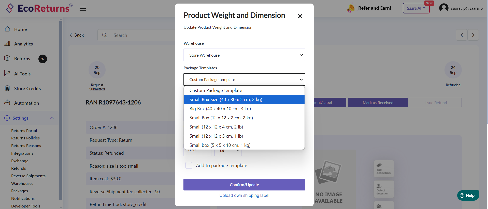 7. You can use the Package template while you're creating a reverse shipment. The dimensions will be populated once you select the template.