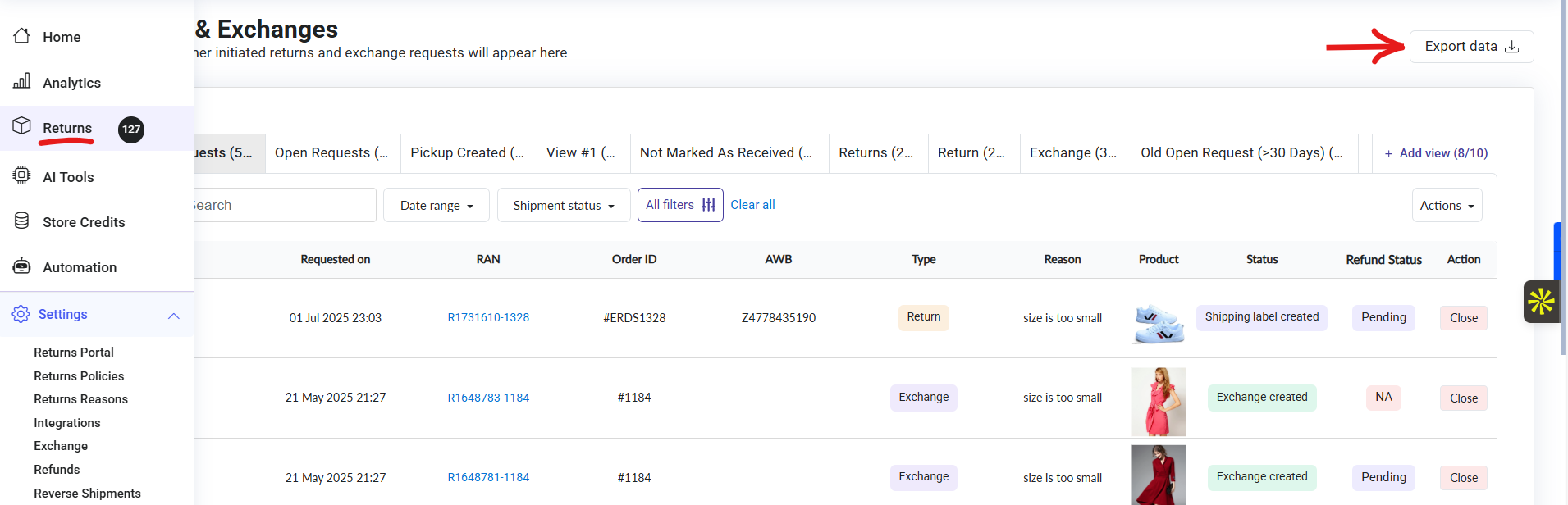 You can easily download the returns/ exchange date selected by date range in an excel sheet. To downolad, simply follow the below steps: