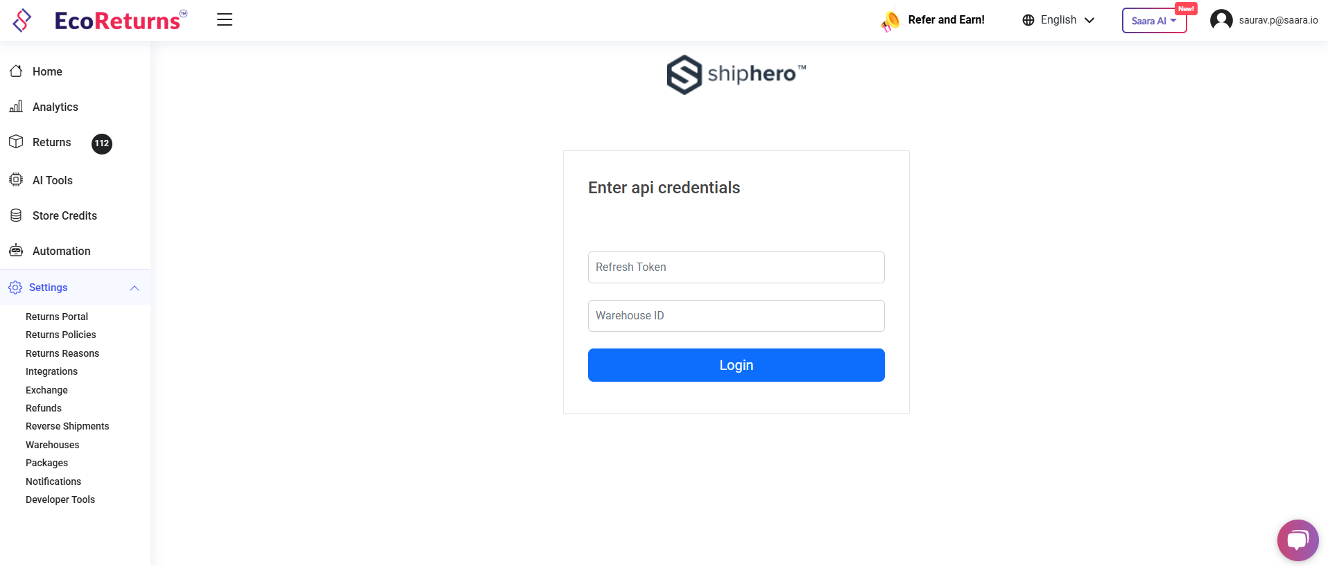 - Click on Login and integrate Shiphero with EcoReturns