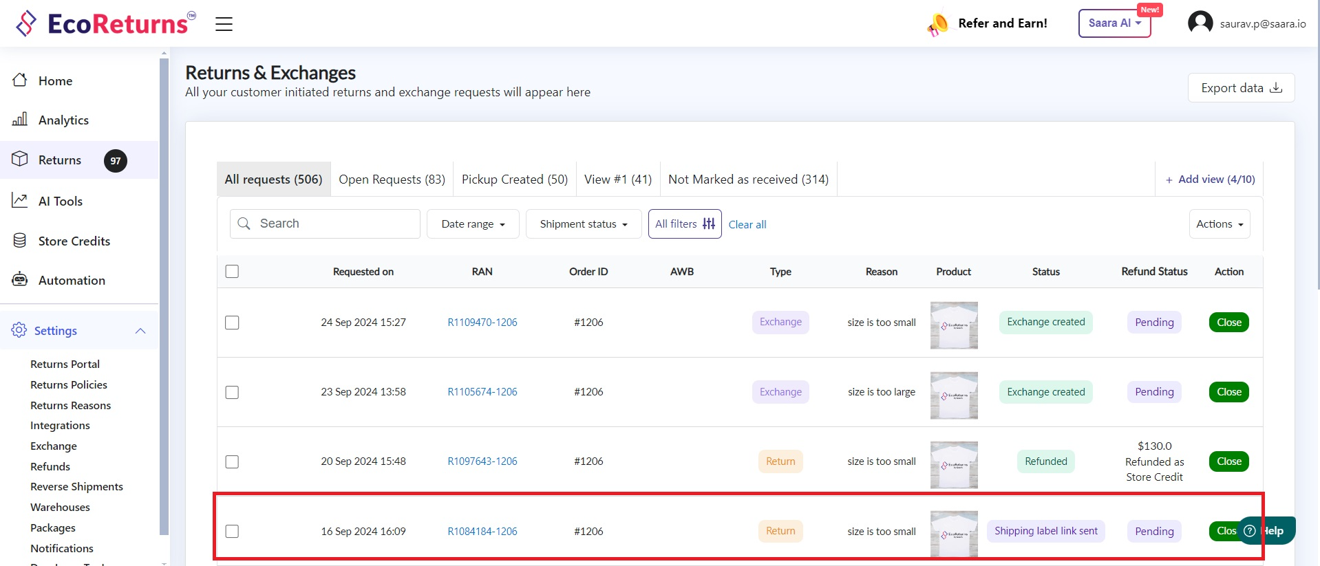 3. Next, you will see the list of the returns and exchanges that your customers have initiated