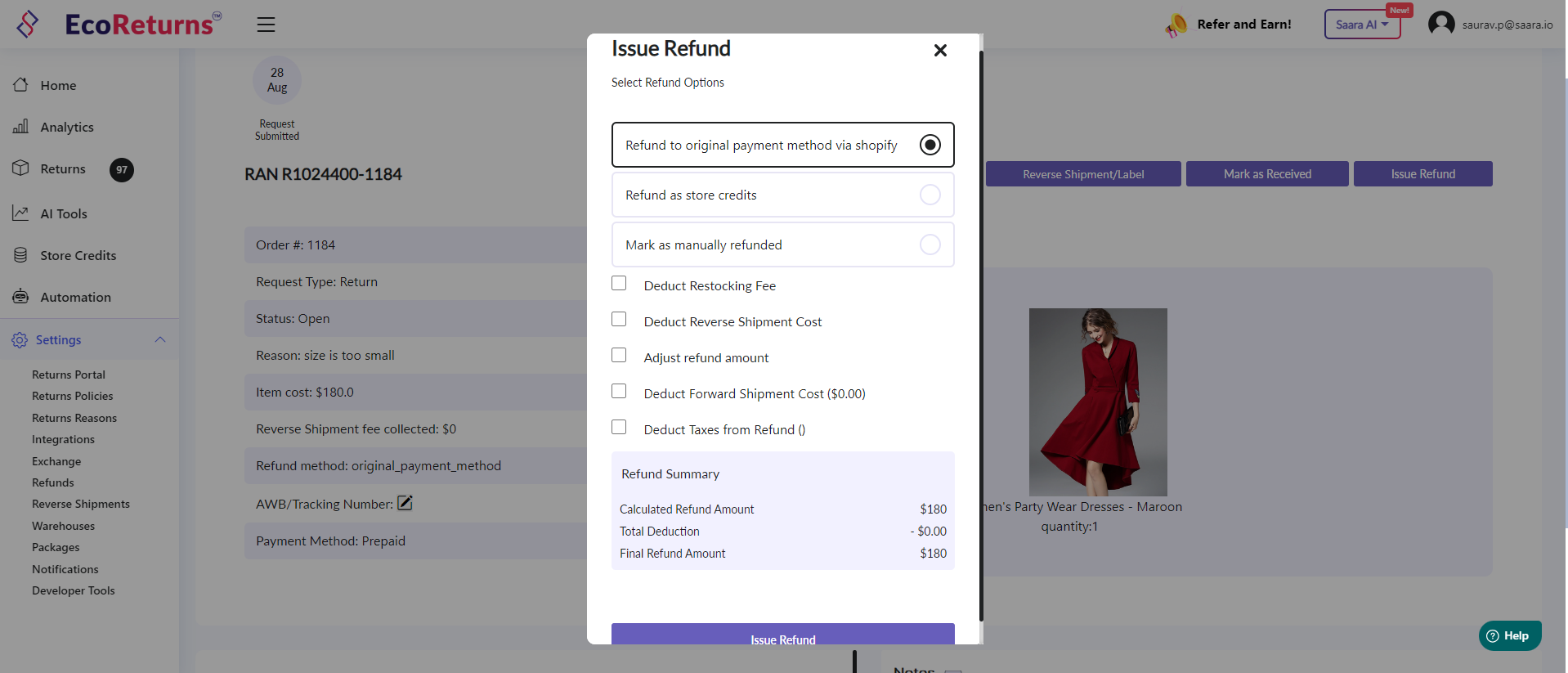 Issue refund instantly from EcoReturns dashboard | Best Shopify returns app | Returns and Exchanges