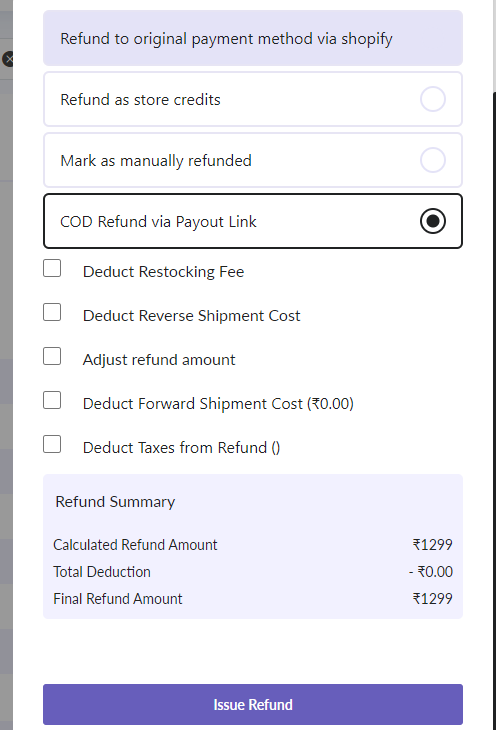 - COD Refund via Payout Link (Only India) - If you want to refund to the customer's bank account for Cash on Delivery orders then doing it manually is a huge hassle. EcoReturns make the process seamless with it's integrations of Razorpay, Cashfree. Once you click on issue refund, customer will receive a payout link where they can enter the bank account details or UPI ID to get a refund to their desired refund mode.