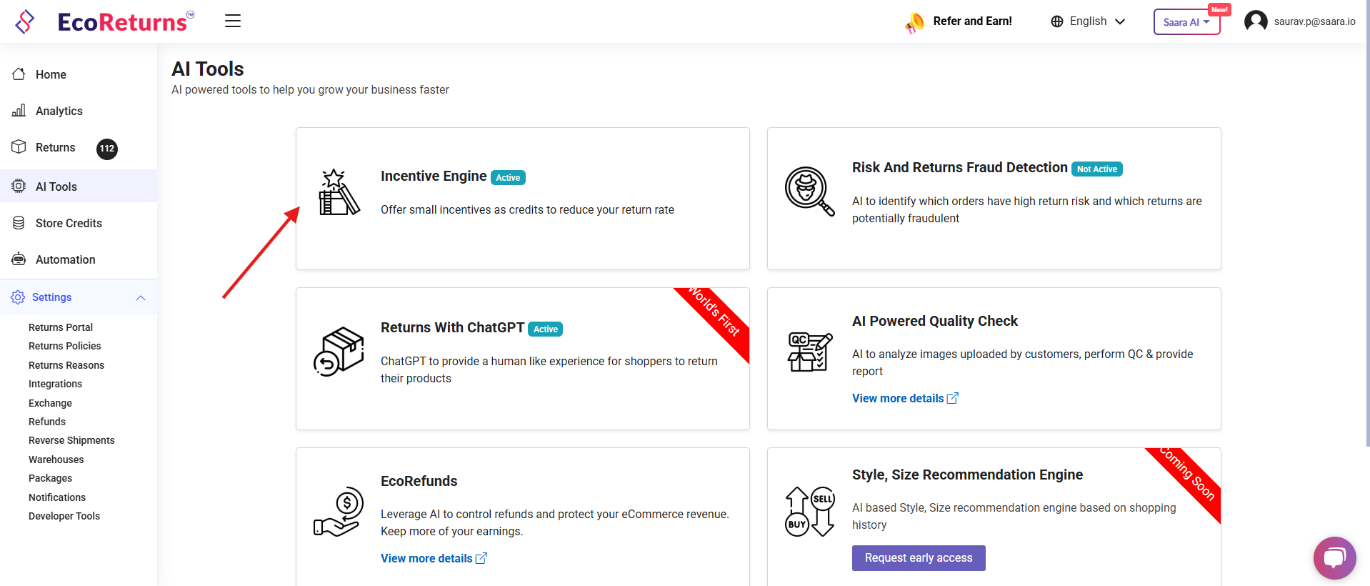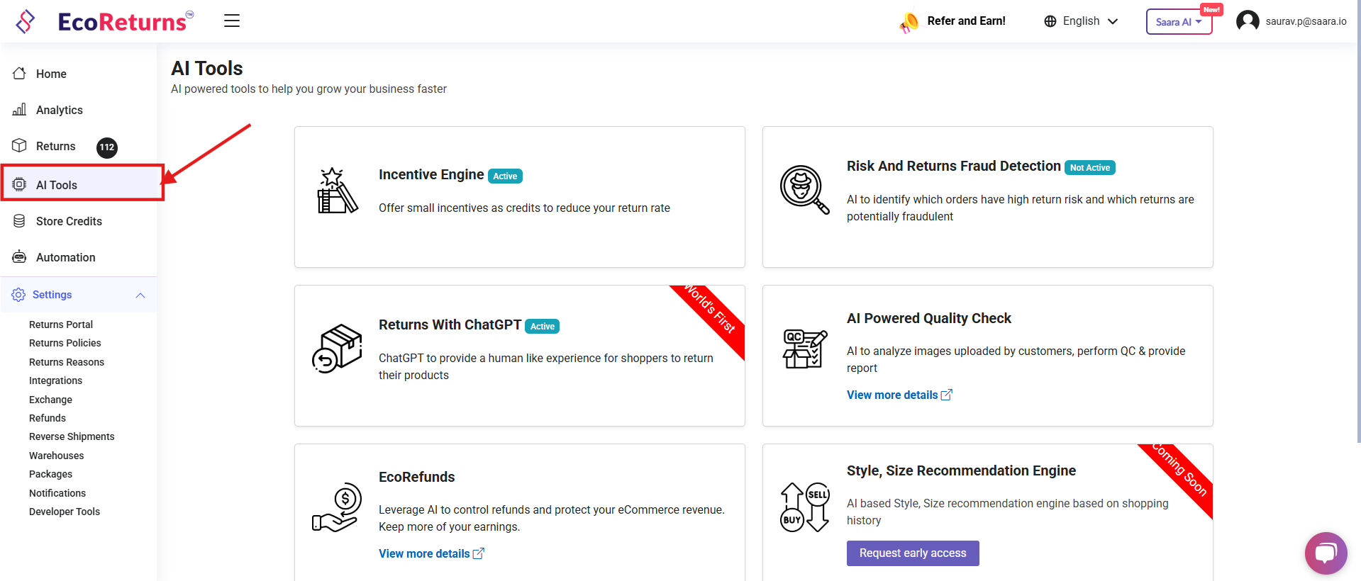 - Login to your EcoReturns dashboard and access the AI tools page from the left side menu